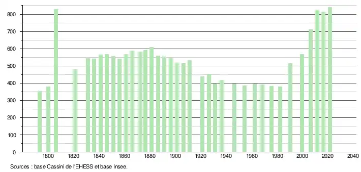 L'évolution du nombre d'habitants est connue à travers les recensements de la population effectués dans la commune depuis 1793. Pour les communes de moins de 10 000 habitants, une enquête de recensement portant sur toute la population est réalisée tous les cinq ans, les populations légales des années intermédiaires étant quant à elles estimées par interpolation ou extrapolation[25]. Pour la commune, le premier recensement exhaustif entrant dans le cadre du nouveau dispositif a été réalisé en 2006[26].