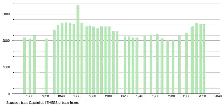 L'évolution du nombre d'habitants est connue à travers les recensements de la population effectués dans la commune depuis 1793. Pour les communes de moins de 10 000 habitants, une enquête de recensement portant sur toute la population est réalisée tous les cinq ans, les populations légales des années intermédiaires étant quant à elles estimées par interpolation ou extrapolation[26]. Pour la commune, le premier recensement exhaustif entrant dans le cadre du nouveau dispositif a été réalisé en 2007[27].
