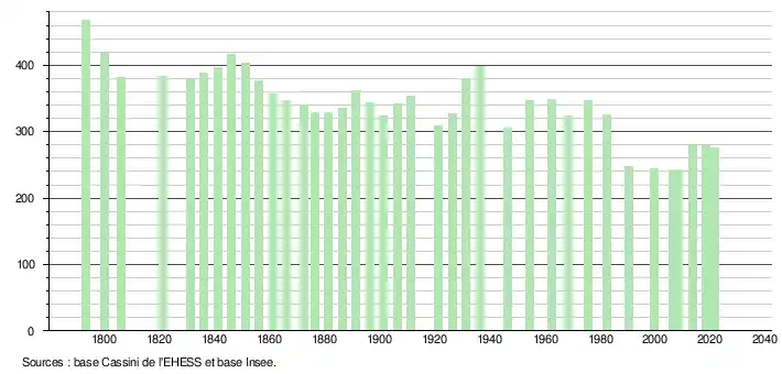 L'évolution du nombre d'habitants est connue à travers les recensements de la population effectués dans la commune depuis 1793. Pour les communes de moins de 10 000 habitants, une enquête de recensement portant sur toute la population est réalisée tous les cinq ans, les populations légales des années intermédiaires étant quant à elles estimées par interpolation ou extrapolation[29]. Pour la commune, le premier recensement exhaustif entrant dans le cadre du nouveau dispositif a été réalisé en 2008[30].