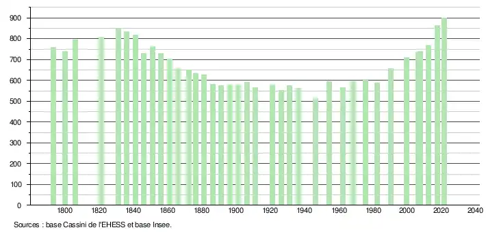 L'évolution du nombre d'habitants est connue à travers les recensements de la population effectués dans la commune depuis 1793. Pour les communes de moins de 10 000 habitants, une enquête de recensement portant sur toute la population est réalisée tous les cinq ans, les populations légales des années intermédiaires étant quant à elles estimées par interpolation ou extrapolation[32]. Pour la commune, le premier recensement exhaustif entrant dans le cadre du nouveau dispositif a été réalisé en 2007[33].