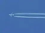 Traînée de condensation Pas un genre de l'OMM mais un type de Genitus[34]. Long et fin nuage formé après le passage d'un avion à haute altitude (appelé contrail en anglais). Il peut persister de quelques minutes à plusieurs heures selon la stabilité et l'humidité relative à la hauteur de production[35] Cirrus homogenitus