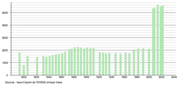 L'évolution du nombre d'habitants est connue à travers les recensements de la population effectués dans la commune depuis 1793. Pour les communes de moins de 10 000 habitants, une enquête de recensement portant sur toute la population est réalisée tous les cinq ans, les populations légales des années intermédiaires étant quant à elles estimées par interpolation ou extrapolation[27]. Pour la commune, le premier recensement exhaustif entrant dans le cadre du nouveau dispositif a été réalisé en 2008[28].