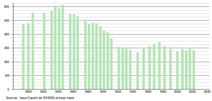 L'évolution du nombre d'habitants est connue à travers les recensements de la population effectués dans la commune depuis 1793. Pour les communes de moins de 10 000 habitants, une enquête de recensement portant sur toute la population est réalisée tous les cinq ans, les populations légales des années intermédiaires étant quant à elles estimées par interpolation ou extrapolation[36]. Pour la commune, le premier recensement exhaustif entrant dans le cadre du nouveau dispositif a été réalisé en 2006[37].
