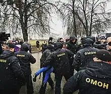 Le , l'OMON a pris d'assaut le camp de tentes de l'opposition sur la place d'Octobre, mettant fin violemment à la révolution pacifique du jean contre le président Alexandre Loukachenko. Des milliers de personnes ont été battues et des centaines ont été arrêtées, dont le candidat de l'opposition à la présidence, Alexandre Kazouline[5].