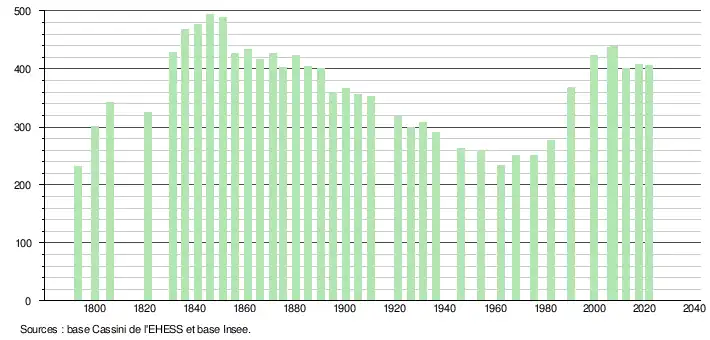 L'évolution du nombre d'habitants est connue à travers les recensements de la population effectués dans la commune depuis 1793. Pour les communes de moins de 10 000 habitants, une enquête de recensement portant sur toute la population est réalisée tous les cinq ans, les populations légales des années intermédiaires étant quant à elles estimées par interpolation ou extrapolation[15]. Pour la commune, le premier recensement exhaustif entrant dans le cadre du nouveau dispositif a été réalisé en 2007[16].