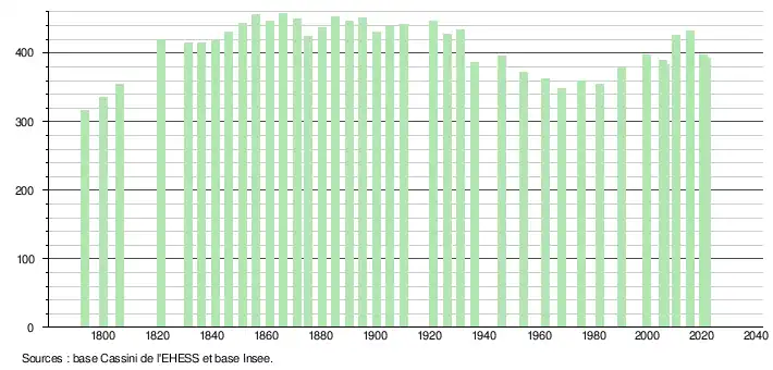 L'évolution du nombre d'habitants est connue à travers les recensements de la population effectués dans la commune depuis 1793. Pour les communes de moins de 10 000 habitants, une enquête de recensement portant sur toute la population est réalisée tous les cinq ans, les populations légales des années intermédiaires étant quant à elles estimées par interpolation ou extrapolation[27]. Pour la commune, le premier recensement exhaustif entrant dans le cadre du nouveau dispositif a été réalisé en 2005[28].