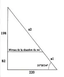Le conduit sud de la chambre du roi est incliné d'un angle de 45° correspondant à une pente simple de 1/1 et le conduit nord, d'un angle de 32° 30' correspondant à une pente de 7/11[11].