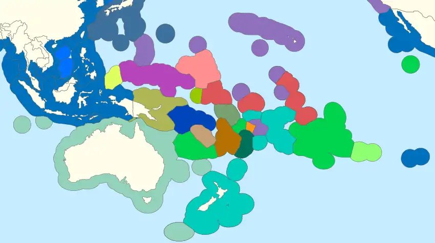 Dans les années 1970, les linguistes puis les géographes proposent, dans leurs travaux scientifiques, de subdiviser l'Océanie en « Océanie proche » et « Océanie lointaine »[14] : dans la première, les terres sont toujours en vue en moins d'une journée de navigation, tandis que dans la seconde, elles sont accessibles uniquement en navigation hauturière. Néanmoins, ce nouveau découpage, basé sur des éléments d'histoire naturelle (tectonique des plaques) et de navigation, ne fait pas encore l'unanimité.