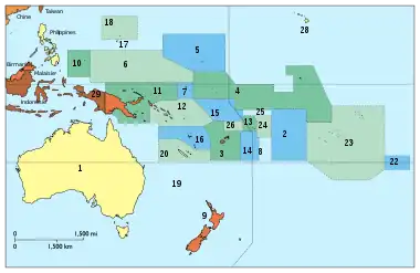 | Principales villes | Sydney, Melbourne, Canberra, Brisbane, Perth, Adélaïde, Honolulu, Auckland, Wellington, Nouméa, Papeete |