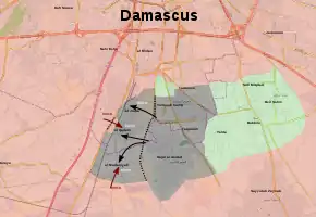 Le , les rebelles lancent une grande attaque, surnommée « bataille de l'Armageddon » contre les troupes loyalistes défendant Damas. Ils entrent dans le district damascène de Jobar (en). Ces derniers effectuent également des attaques sur Adra au nord-est de la capitale[37],[38],[39]. Les combats touchent les quartiers de Jobar, Qaboun et Tadamon[40]. Le 7 février, les bombardements loyalistes sont alors les plus intenses depuis des mois à Damas[40].