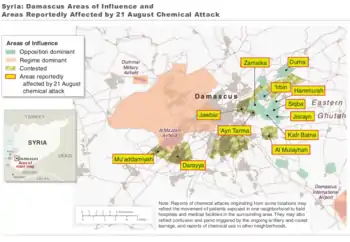 Fin 2012, le régime syrien commence à recourir aux armes chimiques et en particulier au gaz sarin[77],[78]. Dans les villes et les quartiers tenus par les rebelles de la Ghouta, à l'est et au sud de Damas, les attaques chimiques débutent en mars 2013, mais elles sont initialement de faible ampleur[77],[78]. Cependant le 21 août, une offensive de l'armée syrienne s'accompagne d'une attaque au sarin particulièrement meurtrière : entre plusieurs centaines et près de 2 000 personnes sont tuées selon les estimations, dont un grand nombre de femmes et d'enfants[79],[77]. Pour les pays occidentaux, la « ligne rouge » est franchie et les États-Unis, la France et le Royaume-Uni envisagent sérieusement d'intervenir militairement en Syrie en lançant une campagne de frappes aériennes contre le régime de Bachar el-Assad[80]. Mais à Londres, la Chambre des communes vote contre une intervention tandis qu'à Washington, le président Barack Obama hésite et demande l'autorisation du Congrès[81],[82]. La Russie propose alors un plan de démantèlement de l'arsenal chimique syrien, sous la supervision de l'OIAC[83]. Le régime syrien accepte et le , les États-Unis et la Russie annoncent qu'un accord a été trouvé[84]. Le démantèlent dure plus de deux ans ; l'OIAC annonce la destruction totale de l'arsenal déclaré par Damas le [85]. Le régime syrien ne cesse cependant pas son utilisation d'armes non conventionnelles et commence dès octobre 2013 à recourir au chlore[86],[87].