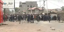 Fin juillet, le M23 a installé ses propres responsables dans les territoires occupés et y perçoit une taxe[67]. Des manifestations violentes éclatent à Goma et dans d'autres villes de l'est du Congo, des civils attaquant du personnel et des bâtiments de la MONUSCO qu'ils accusent d'inaction face aux rébellions régionales en cours. Des manifestants, des Casques bleus et des passants sont tués lors des affrontements[68]. Le North Africa Post prétend que les rebelles ont utilisé les manifestations comme couverture pour des attaques et ont été impliqués dans une attaque contre des Casques bleus marocains à Nyamilima[69]. Un soldat de la MONUSCO est tué dans un affrontement direct avec le M23 à Bunagana[70]. Le , les combats entre le M23 et les FARDC reprennent à Kabingo (territoire de Rutshuru), alors que les rebelles tentaient de récolter les cultures plantées par les habitants[71]. Le , les rebelles et les FARDC se combattent dans cinq villages du Rutshuru[72]. Dans les semaines suivantes, cependant, une trêve est observée le long de la ligne de front. Elle est réprouvée par de nombreux civils locaux qui font valoir que cela permet aux rebelles de consolider leurs gains territoriaux[73].