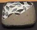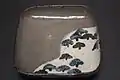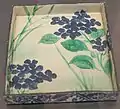 Plat quadrangulaire (kakuzara) à décor d'iris. Entre 1699 et 1711. Grès, engobe blanche, émaux sous couverte. H 25,3 x L 22,8 x P env. 5 cm[6] Plat quadrangulaire (kakuzara) à décor d'iris. Entre 1699 et 1711. Grès, engobe blanche, émaux sous couverte. H 25,3 x L 22,8 x P env. 5 cm[6]