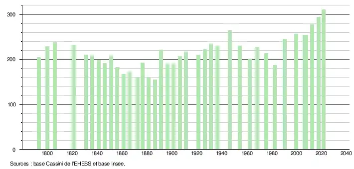 L'évolution du nombre d'habitants est connue à travers les recensements de la population effectués dans la commune depuis 1793. Pour les communes de moins de 10 000 habitants, une enquête de recensement portant sur toute la population est réalisée tous les cinq ans, les populations légales des années intermédiaires étant quant à elles estimées par interpolation ou extrapolation[16]. Pour la commune, le premier recensement exhaustif entrant dans le cadre du nouveau dispositif a été réalisé en 2007[17].