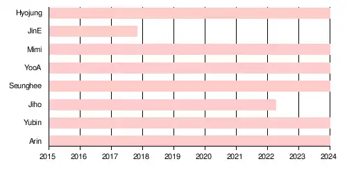 | Hyojung | 효정 | Choi Hyojung | 최효정 |  Sud-coréenne | Leader, chanteuse principale, danseuse secondaire, unnie (la plus âgée) | |