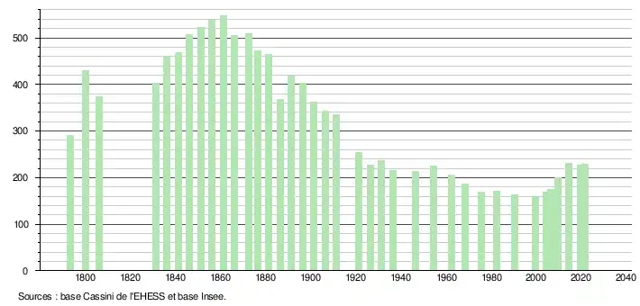 L'évolution du nombre d'habitants est connue à travers les recensements de la population effectués dans la commune depuis 1793. Pour les communes de moins de 10 000 habitants, une enquête de recensement portant sur toute la population est réalisée tous les cinq ans, les populations légales des années intermédiaires étant quant à elles estimées par interpolation ou extrapolation[26]. Pour la commune, le premier recensement exhaustif entrant dans le cadre du nouveau dispositif a été réalisé en 2004[27].
