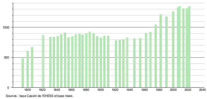 L'évolution du nombre d'habitants est connue à travers les recensements de la population effectués dans la commune depuis 1793. Pour les communes de moins de 10 000 habitants, une enquête de recensement portant sur toute la population est réalisée tous les cinq ans, les populations légales des années intermédiaires étant quant à elles estimées par interpolation ou extrapolation[22]. Pour la commune, le premier recensement exhaustif entrant dans le cadre du nouveau dispositif a été réalisé en 2008[23].