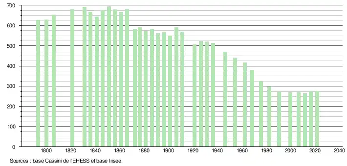 L'évolution du nombre d'habitants est connue à travers les recensements de la population effectués dans la commune depuis 1793. Pour les communes de moins de 10 000 habitants, une enquête de recensement portant sur toute la population est réalisée tous les cinq ans, les populations légales des années intermédiaires étant quant à elles estimées par interpolation ou extrapolation[22]. Pour la commune, le premier recensement exhaustif entrant dans le cadre du nouveau dispositif a été réalisé en 2006[23].