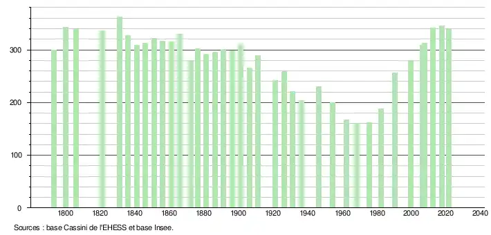 L'évolution du nombre d'habitants est connue à travers les recensements de la population effectués dans la commune depuis 1793. Pour les communes de moins de 10 000 habitants, une enquête de recensement portant sur toute la population est réalisée tous les cinq ans, les populations légales des années intermédiaires étant quant à elles estimées par interpolation ou extrapolation[22]. Pour la commune, le premier recensement exhaustif entrant dans le cadre du nouveau dispositif a été réalisé en 2007[23].