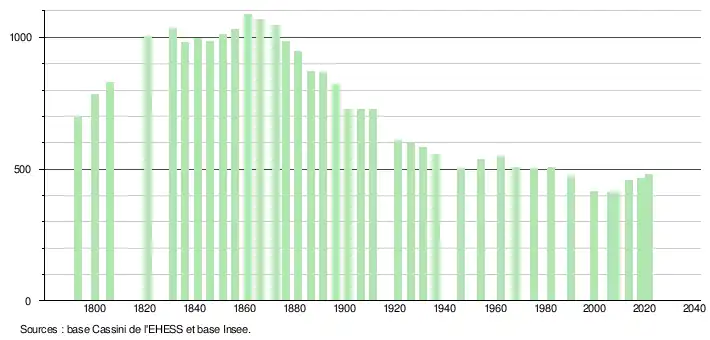 L'évolution du nombre d'habitants est connue à travers les recensements de la population effectués dans la commune depuis 1793. Pour les communes de moins de 10 000 habitants, une enquête de recensement portant sur toute la population est réalisée tous les cinq ans, les populations légales des années intermédiaires étant quant à elles estimées par interpolation ou extrapolation[25]. Pour la commune, le premier recensement exhaustif entrant dans le cadre du nouveau dispositif a été réalisé en 2008[26].