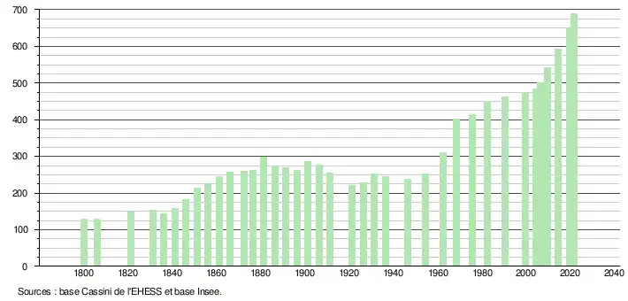 L'évolution du nombre d'habitants est connue à travers les recensements de la population effectués dans la commune depuis 1800. Pour les communes de moins de 10 000 habitants, une enquête de recensement portant sur toute la population est réalisée tous les cinq ans, les populations légales des années intermédiaires étant quant à elles estimées par interpolation ou extrapolation[22]. Pour la commune, le premier recensement exhaustif entrant dans le cadre du nouveau dispositif a été réalisé en 2004[23].
