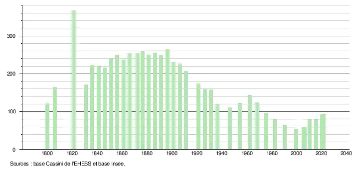 L'évolution du nombre d'habitants est connue à travers les recensements de la population effectués dans la commune depuis 1800. Pour les communes de moins de 10 000 habitants, une enquête de recensement portant sur toute la population est réalisée tous les cinq ans, les populations légales des années intermédiaires étant quant à elles estimées par interpolation ou extrapolation[10]. Pour la commune, le premier recensement exhaustif entrant dans le cadre du nouveau dispositif a été réalisé en 2005[11].