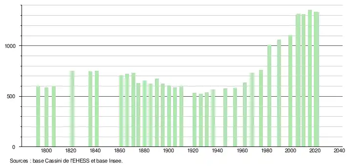 L'évolution du nombre d'habitants est connue à travers les recensements de la population effectués dans la commune depuis 1793. Pour les communes de moins de 10 000 habitants, une enquête de recensement portant sur toute la population est réalisée tous les cinq ans, les populations légales des années intermédiaires étant quant à elles estimées par interpolation ou extrapolation[26]. Pour la commune, le premier recensement exhaustif entrant dans le cadre du nouveau dispositif a été réalisé en 2005[27].