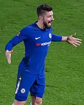 Le , Giroud, en fin de contrat, s'engage pour une saison supplémentaire avec Chelsea[54]. Huit jours plus tard, il remporte la finale de la Ligue Europa, en ouvrant notamment le score face à son ancien club d'Arsenal (4-1). Il termine meilleur buteur de cette compétition avec onze buts[55]. Ce total fait de lui le meilleur buteur français sur une saison en coupe continentale[56]. Il est nommé avec Eden Hazard et Luka Jovic pour le titre de meilleur joueur de la Ligue Europa 2019-2019[57] et fini 3e meilleur joueur de la compétition[58]. Il est ensuite finaliste de la Supercoupe de l'UEFA 2019 où il marque un but. Malgré cette bonne saison européenne, il ne figure pas dans les 30 nommés pour le Ballon d'or 2019 (31e)[59],[60].