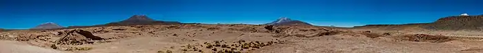 Paysage volcanique autour du volcan avec, de gauche à droite le Tomasamil, le Cañapa, l'Ollagüe et l'Aucanquilcha.