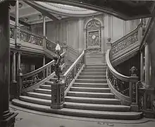 L'Olympic est le paquebot le plus luxueux de son temps. Il propose de nombreuses prestations à ses passagers dont certaines sont assez originales sur un paquebot. Les passagers de première classe ont ainsi accès sur le pont A à un vaste salon de style Louis XV où joue régulièrement l'orchestre du navire[a 59], dans lequel est ajouté à la fin des années 1920 un projecteur de cinéma[a 49]. Au même pont se trouve un somptueux salon de lecture et de correspondance orné de grandes baies vitrées, un fumoir décoré de boiseries d'acajou, de vitraux, et d'une cheminée surmontée d'un tableau du peintre Norman Wilkinson, L'arrivée au Nouveau Monde[a 60]. Sur le pont supérieur, les passagers ont accès à un gymnase pourvu de tous les appareils récents (machines à ramer, à pédaler, chevaux et chameaux électriques)[48]. Le pont A accueille également deux cafés véranda décorés de palmiers. Le navire propose également un restaurant à la carte et une vaste salle à manger (agrémentée d'une piste de danse dans les années 1920[a 49]). Le navire offre également à ces passagers un accès à des bains turcs et une piscine, nouveauté apparue en 1907 sur l'Adriatic[a 61]. Il est également pourvu d'un court de squash.