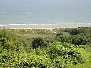 - un talus herbeux et sablonneux (qui correspond au rebord de plateau ou falaise morte) de 30 m à 50 mètres de haut dominant tout ce qui précède ;