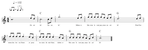 « On est là ! (bis) Même si Macron le veut pas, nous on est là ! Pour l'honneur des travailleurs et pour un monde meilleur, même si Macron le veut pas, nous on est là[2] ! »