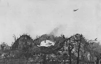 Un F4U Corsair bombarde le mont Umurbrogol dans lequel ont été creusées des casemates shōwa.
