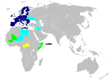 | 2012 | EUCAP Nestor / Somalie | Mission de renforcement des capacités maritimes régionales dans les États de la corne de l'Afrique et dans l'océan Indien occidental[35]. La mission EUCAP Nestor, adoptée par la décision 2012/389/PESC[36], est renommée EUCAP Somalia par la décision (PESC) 2016/2240[37] du 12 décembre 2016. | ||