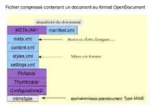 Un format OpenDocument est une archive ZIP contenant un certain nombre de fichiers et de répertoires :
