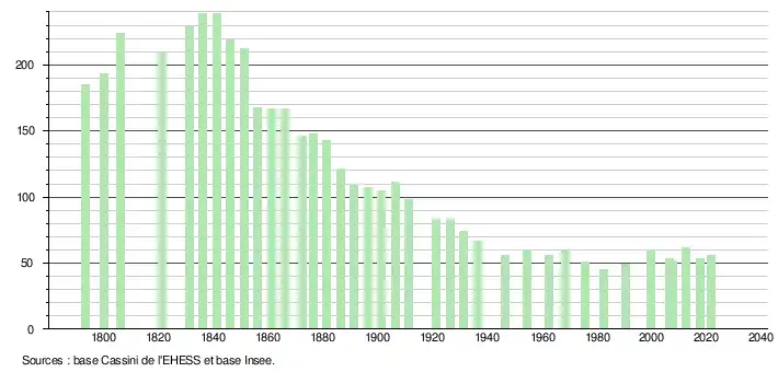 L'évolution du nombre d'habitants est connue à travers les recensements de la population effectués dans la commune depuis 1793. Pour les communes de moins de 10 000 habitants, une enquête de recensement portant sur toute la population est réalisée tous les cinq ans, les populations légales des années intermédiaires étant quant à elles estimées par interpolation ou extrapolation[19]. Pour la commune, le premier recensement exhaustif entrant dans le cadre du nouveau dispositif a été réalisé en 2007[20].