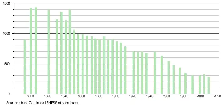 - Par convention dans Wikipédia, le principe a été retenu de n’afficher dans le tableau des recensements et le graphique, pour les populations légales postérieures à 1999, que les populations correspondant à une enquête exhaustive de recensement pour les communes de moins de 10 000 habitants, et que les populations des années 2006, 2011, 2016, etc. pour les communes de plus de 10 000 habitants, ainsi que la dernière population légale publiée par l’Insee pour l'ensemble des communes.