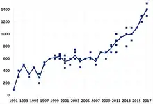 | 2017 | 1422[15] | 1 400[16] à 1 500[17] | + 11,53 % | |