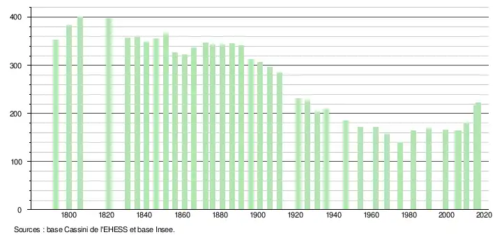 L'évolution du nombre d'habitants est connue à travers les recensements de la population effectués dans la commune depuis 1793. Pour les communes de moins de 10 000 habitants, une enquête de recensement portant sur toute la population est réalisée tous les cinq ans, les populations légales des années intermédiaires étant quant à elles estimées par interpolation ou extrapolation[4]. Pour la commune, le premier recensement exhaustif entrant dans le cadre du nouveau dispositif a été réalisé en 2005[5].