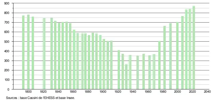 L'évolution du nombre d'habitants est connue à travers les recensements de la population effectués dans la commune depuis 1793. Pour les communes de moins de 10 000 habitants, une enquête de recensement portant sur toute la population est réalisée tous les cinq ans, les populations légales des années intermédiaires étant quant à elles estimées par interpolation ou extrapolation[16]. Pour la commune, le premier recensement exhaustif entrant dans le cadre du nouveau dispositif a été réalisé en 2006[17].