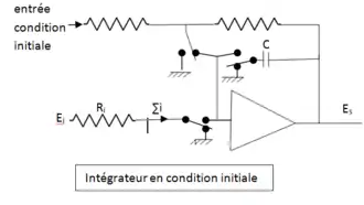 • « IC » (« Initial Conditions ») Les conditions initiales sont appliquées aux intégrateurs le temps est figé au temps . Un jeu de commutateurs convertit chaque intégrateur en un sommateur à une seule entrée, entrée spéciale pour la définition de la condition initiale (voir schéma), ce qui charge la capacité de l'intégrateur à la valeur voulue ;