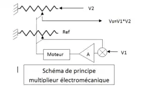 Le multiplieur effectue le produit de deux variables (les deux tensions électriques d'entrée V1 et V2). C'est typiquement une opération non linéaire, il n'y a pas de solution électronique simple pour l'implémenter avec précision. Il a d'abord été réalisé de façon électromécanique à l'aide de deux potentiomètres jumelés et d'un asservissement. Le premier potentiomètre est utilisé pour asservir la position des curseurs jumelés à la tension V1. La tension V2 est appliquée à l'entrée du second potentiomètre et on récupère le produit V1*V2 sur son curseur. L'inconvénient de ce dispositif est qu'il est dissymétrique, avec une bande passante très réduite pour l'entrée V1, qui doit entraîner tout un système mécanique.