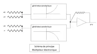 Par la suite,il a été remplacé par un système entièrement électronique qui réalise le produit par l'équation : . Il nécessite deux générateurs de courant « paraboliques », un inverseur pour fournir -X et un amplificateur opérationnel pour fournir la tension de sortie résultat. Les générateurs paraboliques sont constitués d'un réseau de résistances et de diodes, dont les diodes se débloquent successivement en fonction de la tension d'entrée du réseau. Chaque parabole est donc approximée par une suite de segments, au moins une vingtaine de segments sont nécessaires pour obtenir une précision de l'ordre de .