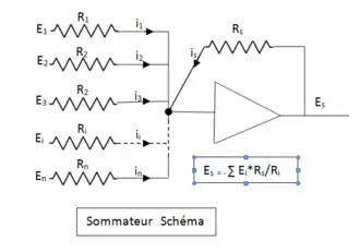 L'objectif de ce module est d'effectuer la somme de plusieurs tensions. Les impédances d'entrée et de contre-réaction sont toutes des résistances. Dans la pratique le rapport Rs/Ri = 1 ou 10, ce qui correspond à un gain de 1 ou 10 selon les entrées utilisées (voir la représentation symbolique du sommateur). Il est à noter que la précision de l'opération dépend directement de la qualité de l'amplificateur opérationnel (courant d'entrée et tension d'offset négligeable) et de la précision de chacune des résistances. (erreur inférieure à sur les calculateurs « haut de gamme »). Pour obtenir une telle précision, les résistances sont du type « bobiné » (bobinage double en sens inverse pour minimiser l'effet d'inductance qui nuirait à la précision dynamique du sommateur). Les valeurs de résistances communément utilisées sont de 100  et pour les calculateurs ayant une référence de 100 volts, ou de 10  et 100  pour une référence de 10 volts.