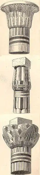 En Égypte, on distingue six ordres : l’ordre palmiforme, l’ordre proto-dorique, l’ordre lotiforme, l’ordre papyriforme, l’ordre campaniforme, l’ordre hathorique.