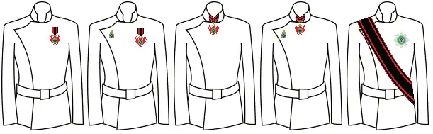 - Chevalier de grand-croix : la médaille est accrochée à un brassard d'épaule, de droite à gauche. En plus de la ceinture, il y a une plaque d'étoile à huit branches chargée, au centre, d'un disque ayant les mêmes caractéristiques que le disque central de la médaille[1].