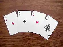 - Poker : les chances d'obtenir un carré servi avec un jeu de 52 cartes au poker sont de 2,4 × 10−4, soit à 4 164 contre 1.
