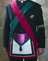 Le bijou du grade est composé d'un triple triangle entrecroisé formant neuf pointes. Au centre un cercle contient à l'intérieur une croix de Saint André et la devise « Gloria in Excelsis Deo » (Gloire à Dieu). Le tout forme une étoile flamboyante, les couleurs sont le rouge et le vert, un ruban porté généralement au bras porte la maxime : « Virtute et Silentio » (Par la Force et par le Silence)[2].
