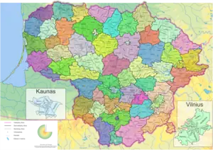 Il se pose pour décrire les subdivisions administratives actuelles de Lituanie un problème de vocabulaire et de traduction, dont la complexité tient en partie au fait que le pays a appliqué plusieurs des systèmes administratifs des pays voisins au cours de son histoire. On a ainsi :