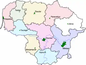 L'État en compte actuellement 10, qui portent tous le nom de leur chef-lieu. Leur tâche principale est d'assurer l'application des lois et de la constitution lituanienne dans les municipalités. Leurs pouvoirs sont assez limités. En français, on peut les appeler districts ou arrondissements.